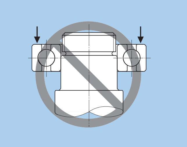 如上圖所示,簡單的對兩邊施加壓力,將軸承壓入,也是不行的,一是壓力要施加在內(nèi)圈,二是受力容易不均勻,將造成軸承滾道面出現(xiàn)壓痕或傷痕。