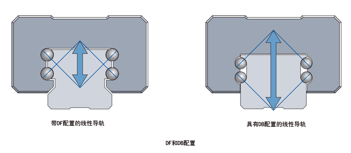 道配置是線性導軌的另一個特點。使用以下替代方案:座圈的DF配置和DB配置,對應于滾柱軸承系統使用的術語(如下圖)。