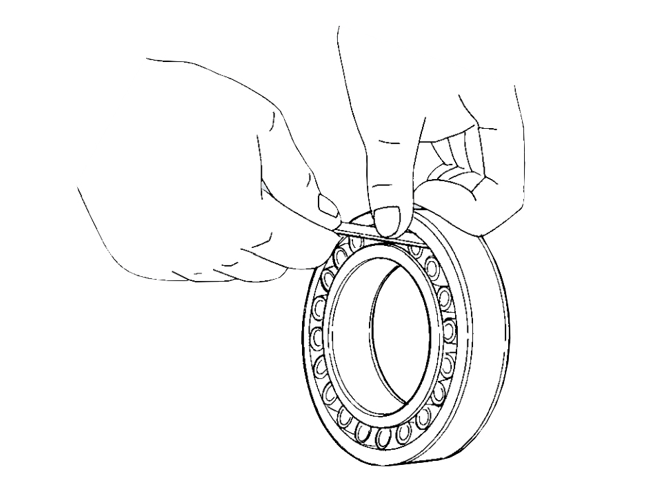 在進行安裝工作之前,打開軸承的包裝,如果軸承要進行潤滑脂潤滑,則其上的防銹涂層不需要去除,如果要進行油潤滑,需要用苯或煤油去除軸承上的防銹涂層。對于帶適配器的軸承,在安裝工作之前檢查其徑向間隙,需要將其放在平坦的工作臺上,并在最上面的滾子和外圈滾道表面之間安裝測厚儀,以測量間隙(如圖四所示)。需要注意的是,不要強行壓入測厚儀或轉動軸承,否則,產生的間隙測量值將大于實際間隙。