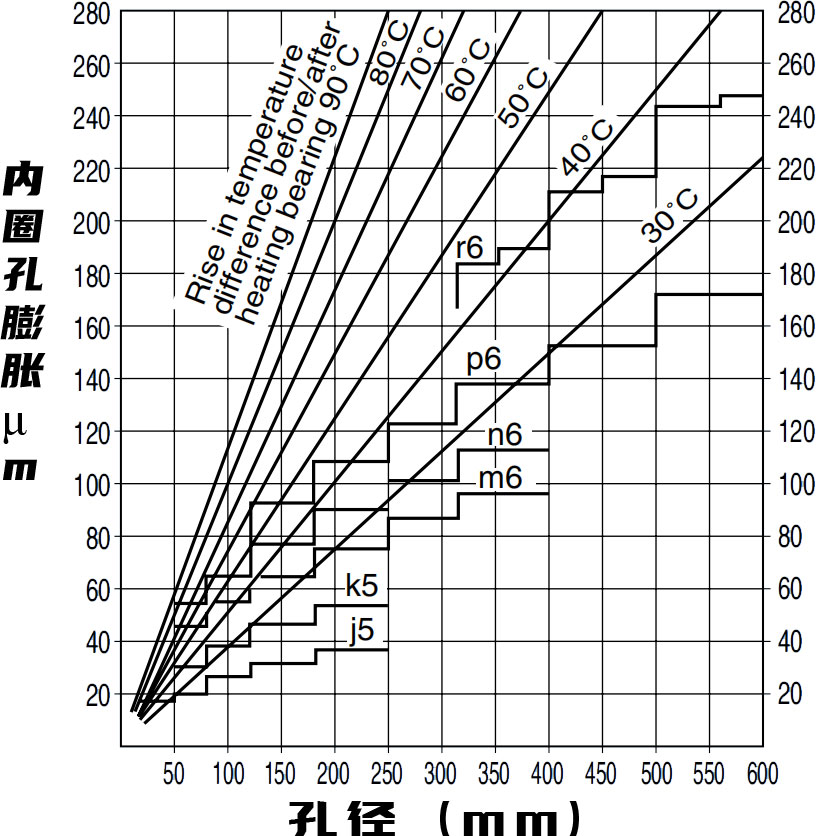 在任何一種情況下,開始安裝時都要小心軸承不會錯位。如果內圈過盈量較大,軸承一般會加熱,使內圈膨脹,很容易插入軸上,根據軸承孔溫差的膨脹量如下圖所示。
