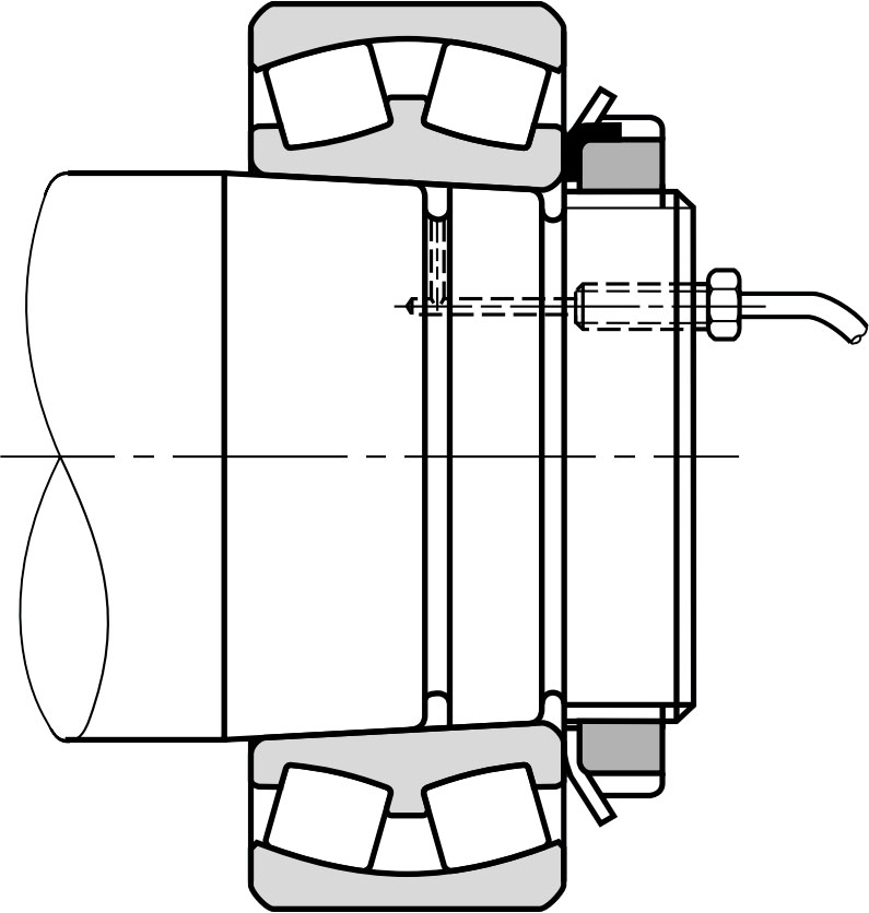 大型軸承需要很大的驅動力,并由液壓安裝,下圖顯示了直接安裝在錐形軸上的軸承,通過這種方法,高壓油被輸送到配合面(噴油),以減少配合面的摩擦和螺母的擰緊力矩,除此之外,可以使用液壓通過液壓螺母或套筒安裝軸承,在以這種方式安裝軸承的情況下,通過在軸向上驅動錐面,過盈量增加,徑向內部間隙減小,可以通過測量間隙減小的量來估計干擾。