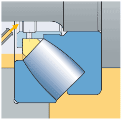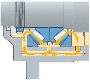 對于高轉速應用,建議使用帶機加工保持架的軸承,同時使用注油潤滑的方式,如上圖所示,對軸承進行持續注油潤滑,轉速高于泵送效應的油潤滑,發熱量也更低。