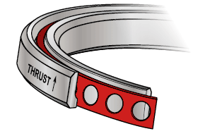 單列角接觸球(A型)軸承只能承受一個方向的軸向(推力)載荷,這類軸承的外徑標有箭頭和“推力”字樣,以指示可向外圈施加推力載荷的方向,如下圖所示,這類軸承以背靠背(DB)方式安裝時,箭頭應背對彼此,在面對面(DF)配對中,箭頭應指向彼此。