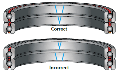 作為配對(雙聯(lián))組件購買的角接觸軸承在外徑和內徑上標記“V”,在安裝過程中,“V”標記應彼此對齊,如下圖所示(在垂直軸中,“V”是朝上還是朝下無關緊要)“V”標記位于徑向跳動的高點,可與軸和殼體上的低點相匹配,以減少裝配后的跳動。