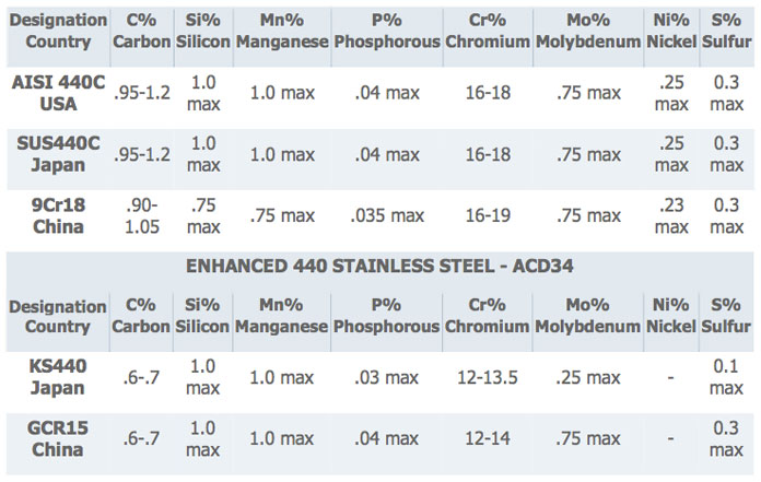 雖然低精度軸承不存在問(wèn)題,但在高精度(ABEC 5P、7P、9P)微型軸承中,這種尺寸穩(wěn)定性不足可能會(huì)導(dǎo)致出現(xiàn)問(wèn)題,為了消除這種不必要的冶金生長(zhǎng),鋼必須進(jìn)行熱穩(wěn)定,通過(guò)在-80°C的低溫下反復(fù)冷卻和回火,以將大部分殘余奧氏體轉(zhuǎn)變?yōu)轳R氏體,下表顯示了上述不銹鋼合金的化學(xué)成分。