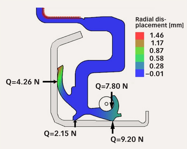 計算安裝在軸上的密封件的能力是一個附加功能,當安裝密封件時,它會在反表面上施加一個力,稱為唇緣力,唇緣力是密封件在靜態和動態操作條件下最重要的參數之一,唇緣力可確保所需的密封性,但也會導致唇緣下的密封摩擦,此外,當密封材料老化時,可以使用彈簧來保持足夠的密封唇力。因此,準確預測不同操作條件下的唇緣力是模擬工具的關鍵要求,這將有助于減少設計迭代次數,從而縮短新產品的上市時間。