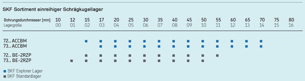 更小的接觸角和更好的保持架為角接觸球軸承提供了更多的可能,SKF最近提供了一系列帶黃銅保持架的單列角接觸球軸承,其接觸角比通常的40°更小,新型25°角接觸球軸承(后綴AC)的范圍概述如上圖所示。