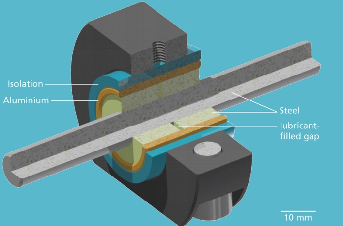 研究人員利用滑動(dòng)軸承中的鋁和軸中的鐵之間產(chǎn)生的電壓將水轉(zhuǎn)化為潤滑劑,Tobias Amann博士解釋道,“我們將所謂的離子液體混合到水中”,“離子液體是含有陰離子和陽離子的流體鹽”,這些離子在電場中重新排列,然后聚集在燒結(jié)金屬套圈的內(nèi)側(cè),其末端指向旋轉(zhuǎn)軸,并由此形成了一種電流產(chǎn)生的保護(hù)層,軸可以在其上滑動(dòng)。