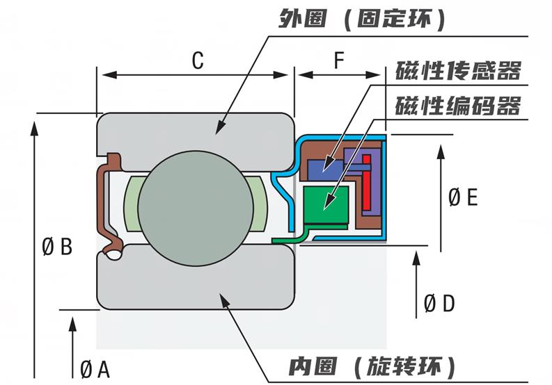 這類軸承是一種集成產品,將軸承與檢測轉速和旋轉方向的旋轉傳感器結合在一起,旋轉傳感器由磁性編碼器(多極磁鐵)和磁性傳感器組成,磁性編碼器固定在軸承的內圈(旋轉環)上,磁性傳感器固定在外圈(固定環)上,隨著軸(和內圈)的旋轉,當磁性編碼器經過磁性傳感器附近時,磁性傳感器感測與其相對的磁性編碼器磁極(N極和S極)的變化,并輸出相應的電信號(矩形波形),通過對這些輸出信號的數值處理,可以計算出轉速。此外,由于相位A輸出和相位B輸出信號具有90度的互電相移,因此也可以檢測旋轉方向。