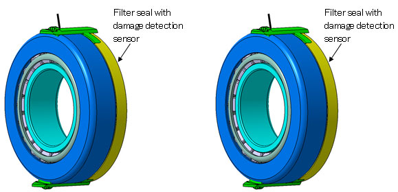 NTN開發(fā)了一種產(chǎn)品,通過在外圈(圓錐滾子軸承上的固定環(huán))上安裝過濾器密封件,并優(yōu)化內(nèi)圈和過濾器密封件之間的間隙,防止剝落碎片排出軸承外部,通過優(yōu)化連接到過濾器密封件的損壞檢測傳感器的靈敏度,NTN實現(xiàn)了一種技術(shù),該技術(shù)可以檢測是否僅在早期發(fā)生剝落,而不檢測細(xì)鐵粉或懸浮金屬顆粒,過濾器密封件具有特殊的結(jié)構(gòu),也允許將其改裝到現(xiàn)有的圓錐滾子軸承上。