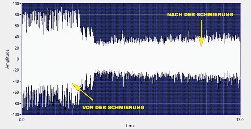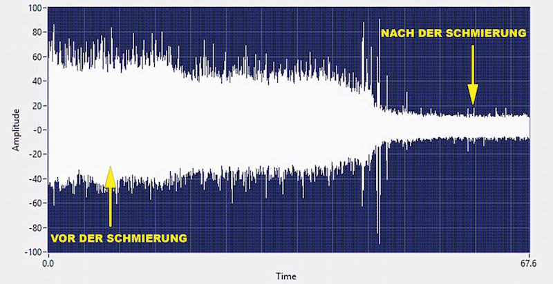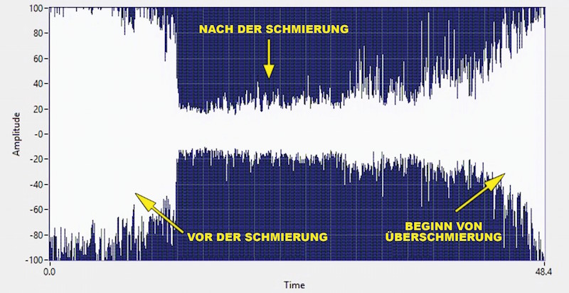 圖3,軸承開始過度潤滑。該記錄顯示了當向軸承中添加更多潤滑脂且超過過度潤滑極限時,dB值和振幅的增加變化。
