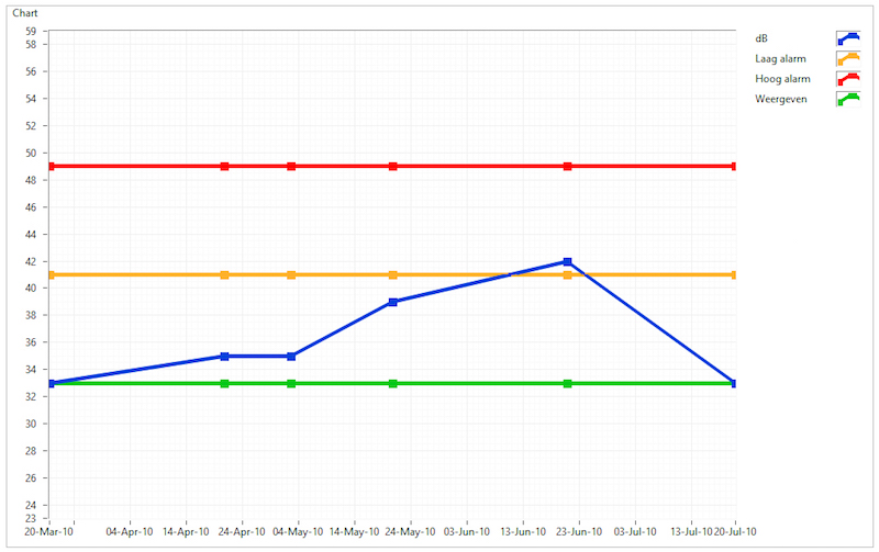 圖4,軸承潤滑歷史。該圖顯示了在驅(qū)動軸承上測量的分貝測量趨勢,根據(jù)基線dB(綠色)、低報警電平(黃色)和極高報警電平(紅色)顯示測量值。