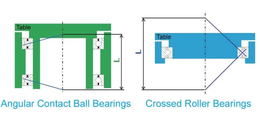 除更緊湊外,交叉滾子軸承也具有更高的剛性,如下圖所示是一個(gè)旋轉(zhuǎn)轉(zhuǎn)盤的橫截面,從力矩載荷施加到轉(zhuǎn)臺(tái)的作用點(diǎn)距離為L(zhǎng),軸承的容許力矩載荷與作用點(diǎn)距離L成比例,如果增加作用點(diǎn)距離L會(huì)增加轉(zhuǎn)臺(tái)的力矩剛度,則需要兩個(gè)角接觸球軸承,由于需要軸承之間的距離,設(shè)備尺寸也會(huì)增加,然而,即使是單個(gè)交叉滾子軸承也可以增加應(yīng)用點(diǎn)距離L,保持設(shè)備緊湊并提高力矩剛度。
