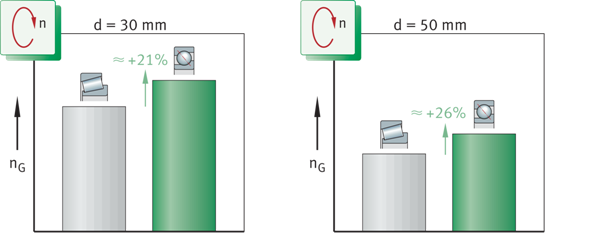 角接觸球軸承 與圓錐滾子軸承的速度比較 nG=極限速度 | ![]() |