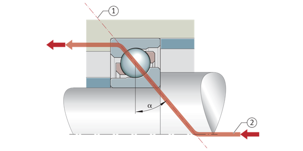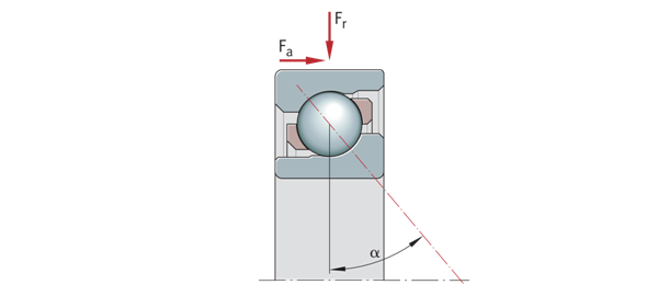 接觸角α是接觸線和徑向平面所包含的角度,在該角度下,載荷從一個滾道傳遞到另一個。軸承的軸向承載能力隨著α的值而增加,即角度越大,軸承所承受的軸向載荷就越高。因此,角接觸球軸承比深溝球軸承更適合支撐更高的軸向力。由于標稱接觸角α=40°,單列角接觸球軸承可以在一側承受高軸向載荷。