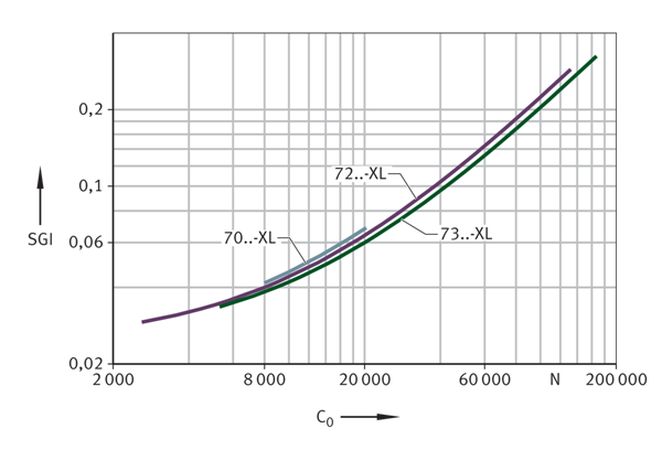 SGI值基于內部標準中軸承的最大允許噪聲水平,該標準是根據ISO 15242計算得出的。為了能夠比較不同的軸承類型和系列,將SGI值與基本額定靜載荷C0進行對比。