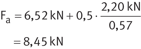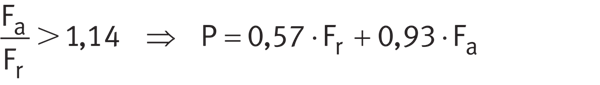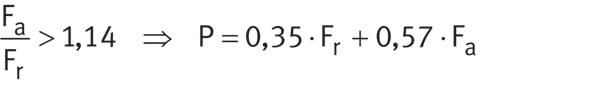 為了計算等效動態軸承載荷P,然后將Fa的計算值用于軸承A,因為Fa/FrA>1,14(8,45 kN/7,30 kN>1,14)。