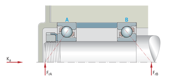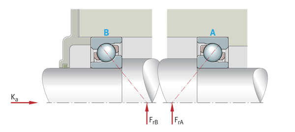 調整后的軸承布置 具有兩個O形排列的單列角接觸球軸承,外力 Ka=作用在軸承上的外部軸向力 FrA=徑向載荷,軸承A FrB=徑向載荷,軸承B | ![]() |