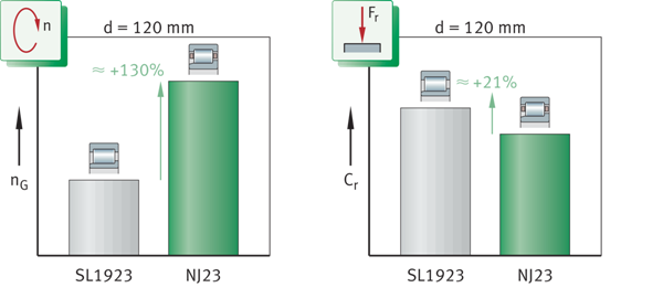 帶保持架/滿裝圓柱滾子軸承,速度和承載能力的比較: nG=極限速度 Cr=基本動載荷額定值 SL1923=滿裝圓柱滾子軸承 NJ23=帶保持架的圓柱滾子軸承 | ![]() |