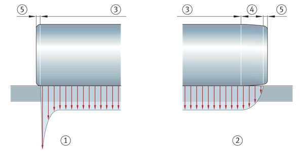 滾子和應(yīng)力分布 ①圓柱滾子輪廓(峰值高應(yīng)力) ②帶異形端部的滾子(峰值無應(yīng)力) ③圓柱形中心區(qū)域 ④對數(shù)漸縮區(qū) ⑤邊緣圓角 | ![]() |