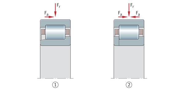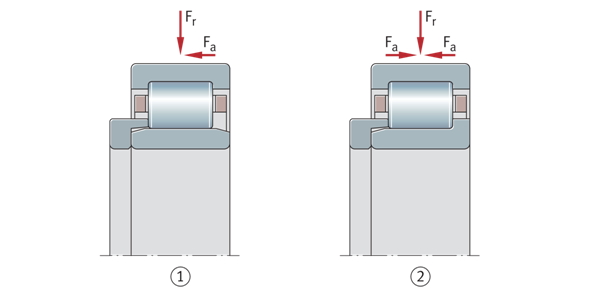 單列圓柱滾子軸承 半定位或定位軸承 Fr=徑向載荷 Fa=軸向載荷 ①圓柱滾子軸承NJ(半定位軸承) ②圓柱滾子軸承NUP(定位軸承) | ![]() |