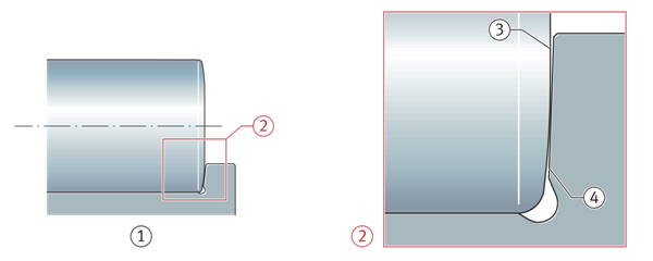 滾子端面/肋面接觸幾何形狀 修改的滾子端面 ①帶內(nèi)圈圓柱滾子軸承 ②詳圖(不按比例) ③滾筒末端 ④肋 | ![]() |