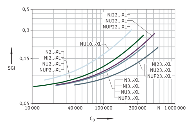 SGI值基于內(nèi)部標(biāo)準(zhǔn)中軸承的最大允許噪聲水平,該標(biāo)準(zhǔn)是根據(jù)ISO 15242計算得出的。為了能夠比較不同的軸承類型和系列,將SGI值與基本額定靜載荷C0進行對比。