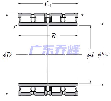 軸承型號:4R5405,四列圓柱滾子軸承帶空心滾柱&銷式保持架,其基礎型號為5405,前綴列表:【4R:四列】