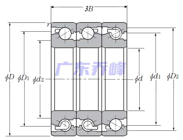 軸承型號:BST50X100-1BDBT,滾珠絲杠用三列推力角接觸球軸承 - DBT配對,開式,兩排承受軸向載荷,其基礎型號為50X100,前綴列表:【BST:Ball Screw Support,即滾珠絲杠支撐】,后綴列表:【-1B:標準預緊】【DBT:三列配對 / \ /】