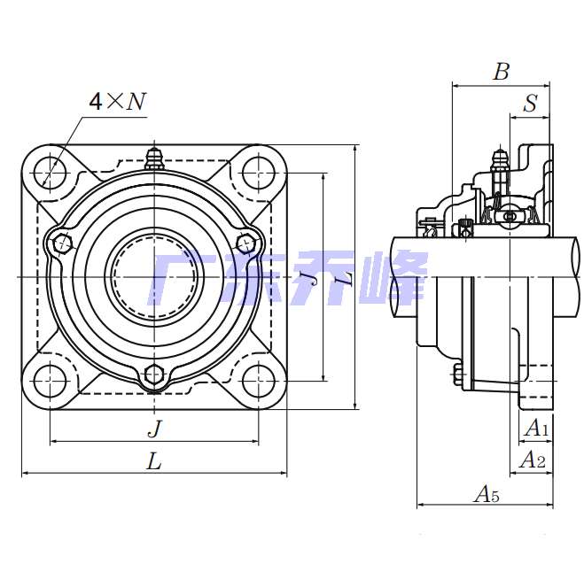 軸承型號:C-UCF312-204D1,四螺栓方形法蘭式軸承座,鑄造外殼,帶緊定螺釘,鑄造防塵蓋,開式端蓋,UCF型