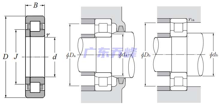 NUP:外圈雙擋邊,內(nèi)圈單擋邊,另一側(cè)帶平擋圈
