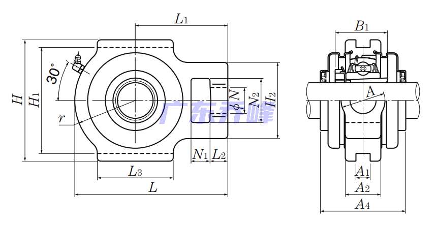 軸承型號:S-UKT206D1(配合軸承:HE2306X),滑塊式軸承座,鑄造外殼,帶緊定襯套,壓制鋼防塵蓋,開式端蓋,UKT型