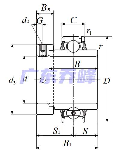 軸承型號:UELS307-104D1,帶偏心鎖緊套的外球面軸承,寬外圈 - 圓柱內徑,其基礎型號為307-104,前綴列表:【UEL:寬內圈,鎖圈帶拋油環】【S:圓柱外圈】,后綴列表:【D1:帶油槽油孔,可再潤滑】